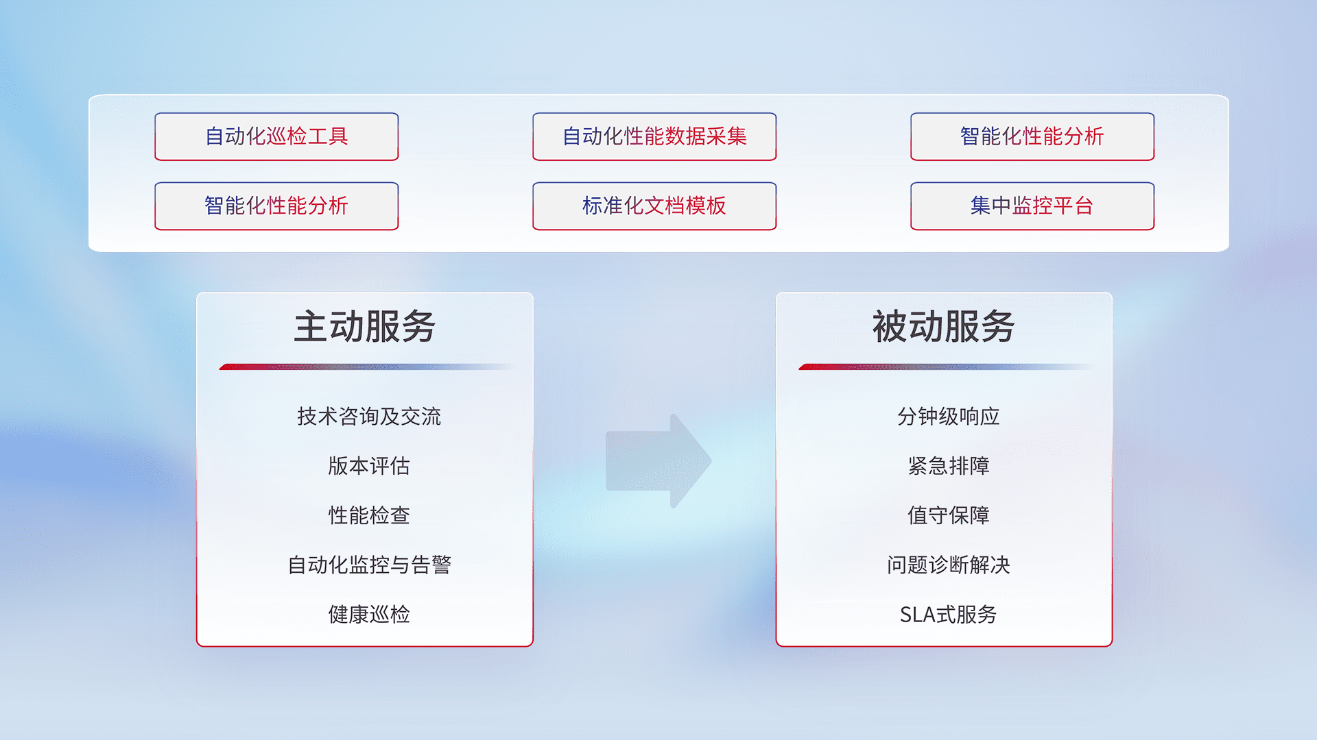 智能化工具和标准化文档,,,保障服务质量,,提供主动服务(包含技术咨询、、、、版本评估、、性能检查、、、、自动化监控与告警、、、、健康巡检)和被动服务包含(分钟级响应、、紧急排障、、、值守保障、、、问题诊断解决、、、SLA服务)。。